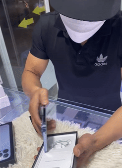 Khi vị khách "đập hộp", chủ tiệm đã quay lại clip và đề nghị khách chụp một tấm hình để làm kỷ niệm. Tiếp đó, thanh niên này cầm chiếc điện thoại xoay qua lại, nhìn kỹ để kiểm tra.