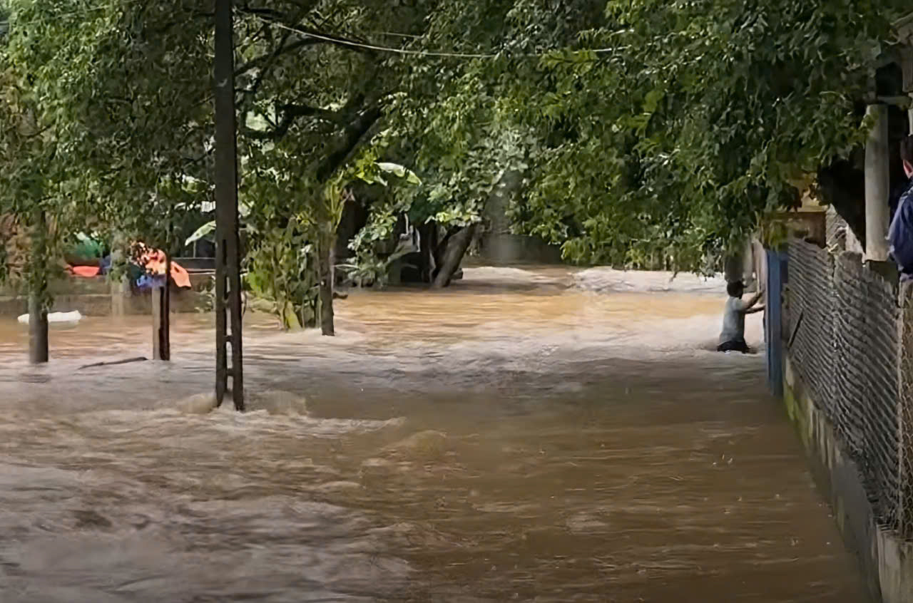 Một người dân đã ghi lại hình ảnh một người đàn ông cõng một bé gái tầm 2 tuổi trên vai, người này dùng một tay giữ lấy cháu bé và mò mẫm đi trên đường đã bị nước lũ dâng cao có đoạn gần tới ngực, chảy xiết.