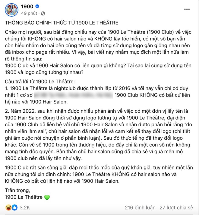 Theo đó, 1900 Le Théâtre (club nổi tiếng ở Hà Nội) cho biết đã có nhiều người hiểu nhầm và tràn vào fanpage, nhắn tin... khi cho rằng đây chính là salon trong lùm xùm hiến tóc gây xôn xao dư luận. Fanpage của club này đã đăng một bài viết đính chính về vấn đề trên, tuy nhiên có vẻ như điều đó vẫn chưa khiến các cư dân mạng tin tưởng bởi cả 2 thương hiệu này lại có logo rất giống nhau. Trước thông tin đó, fanpage đã tiết lộ cuộc nói chuyện bất ngờ với chủ 1900 Hair Salon về vấn đề này.