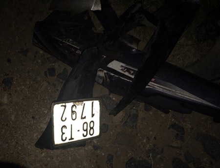 Xe máy của vợ chồng ông Em bị tàu SE2 nghiền nát còn trơ lại biển số. Ảnh: H.Lê. |