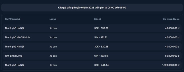 Thời gian từ ngày 15/9 đến 23/9, Công ty Đấu giá hợp danh Việt Nam đã đấu giá thành công 493 biển số xe ôtô, dự kiến thu được 214 tỉ đồng. Đến ngày 30/9, đã có 76 người hoàn thành nghĩa vụ tài chính bằng cách nộp gần 17 tỉ đồng và có 3 người đã nhận đăng ký xe.