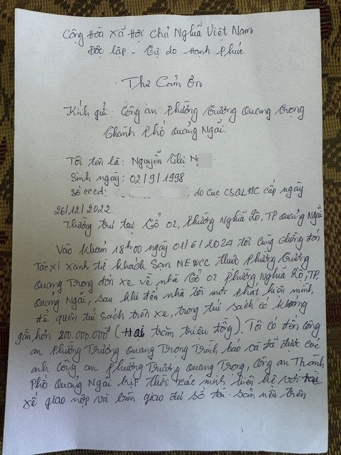 Lúc xuống xe vào nhà do vội vã, chị N. để quên túi xách chứa số tài sản nói trên. Chị N. liên hệ với tổng đài và tài xế taxi không được nên cùng chồng đến trình báo Công an phường nhờ tìm lại tài sản.