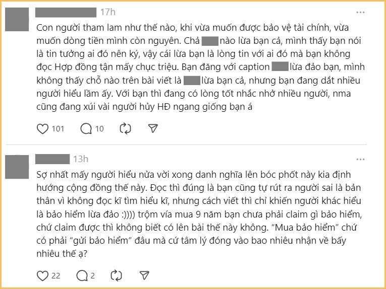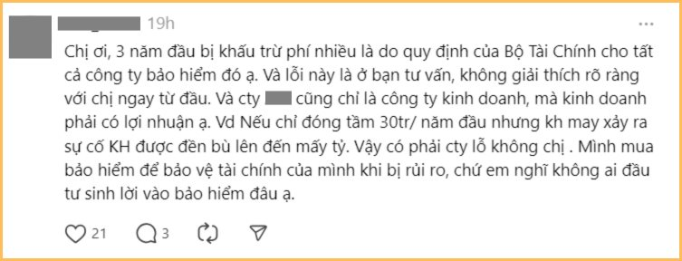Bài đăng hiện vẫn đang thu hút sự quan tâm của CĐM. Trong phần bình luận, có người an ủi, có người chia sẻ bài học đắt giá tương tự, cũng có người cho rằng đơn vị bảo hiểm không có lỗi, lỗi nằm ở tư vấn viên và ở chính người mua bảo hiểm.