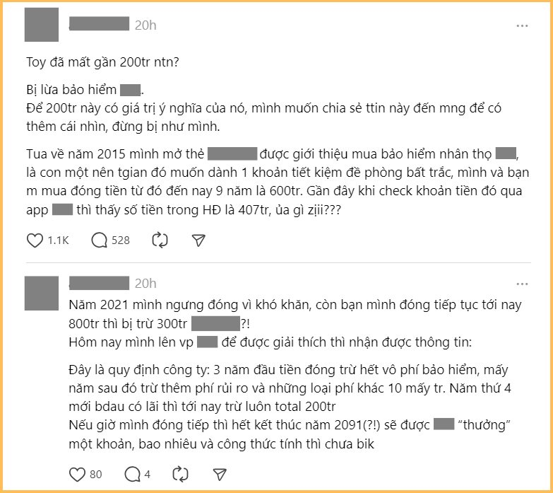 Câu chuyện có thể tóm tắt như sau: Năm 2015 khi mở thẻ tại một ngân hàng nọ, “bảnh” này được nhân viên ngân hàng giới thiệu mua bảo hiểm nhân thọ. Cô đã ký hợp đồng và đóng phí bảo hiểm được 9 năm với tổng số tiền đã đóng là 600 triệu đồng. Tuy nhiên gần đây khi kiểm tra khoản tiền đã đóng trên ứng dụng của đơn vị bảo hiểm, cô thấy số tiền trong hợp đồng chỉ là 407 triệu đồng, chứ không phải 600 triệu đồng.