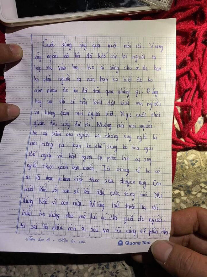 Nội dung bức thư có đoạn: "Tôi mong sẽ không có ai là nạn nhân tiếp theo sau chuyện này, con mệt lắm rồi con sẽ bắt đầu cuộc sống mới Mẹ đừng khổ vì con nữa".