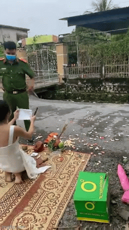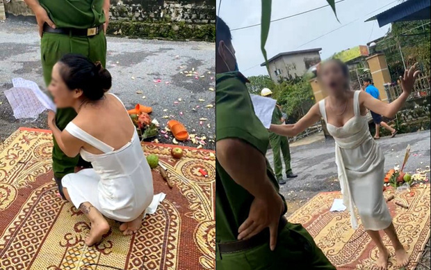Trong đoạn clip, một người phụ nữ mặc váy trắng 2 dây mang vàng hương, hoa, đồ cúng,… trải chiếu ngồi trước nhà 1 người dân trên địa bàn. Khi lực lượng chức năng có mặt tại hiện trường và yêu cầu giải tán, người phụ nữ tiếp tục gõ mõ, cúng.