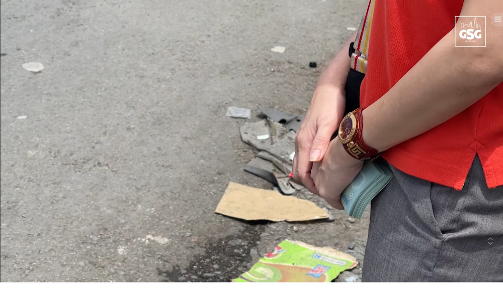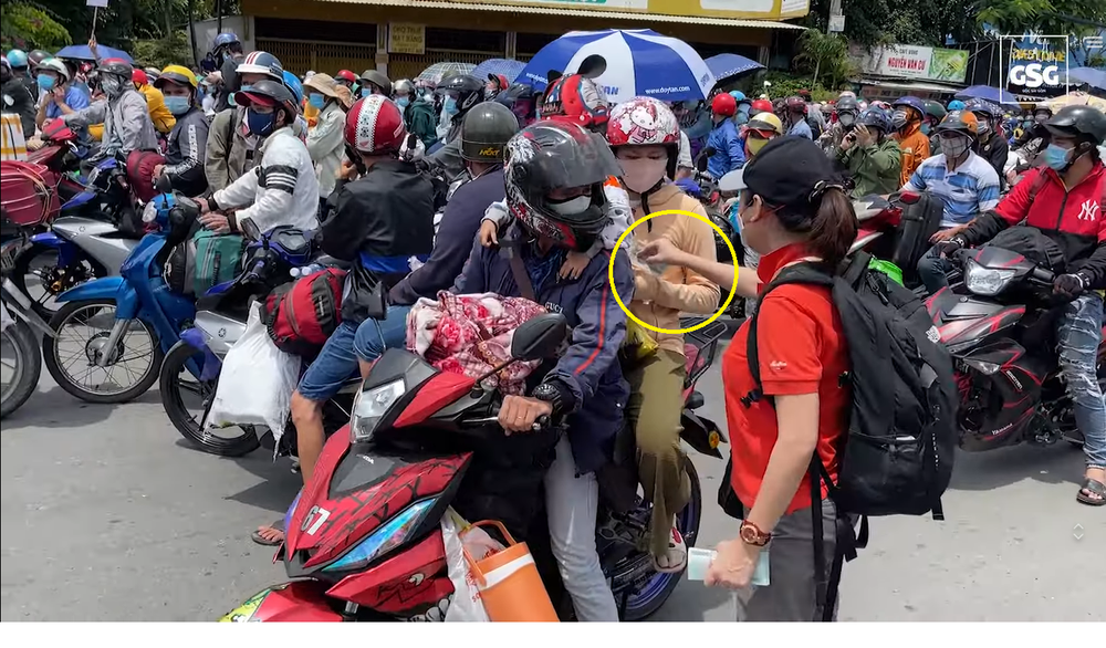 Cô gái trẻ cầm xấp tiền đứng một góc bên lề đường. Cô trật tự quan sát, lựa những trường hợp có con nhỏ, khó khăn đang tay xách nách mang nhanh chóng tặng họ tiền. Luồn lách qua dòng người đông đúc, cô đưa tờ 500k xong rồi vẫy tay chào tạm biệt họ.