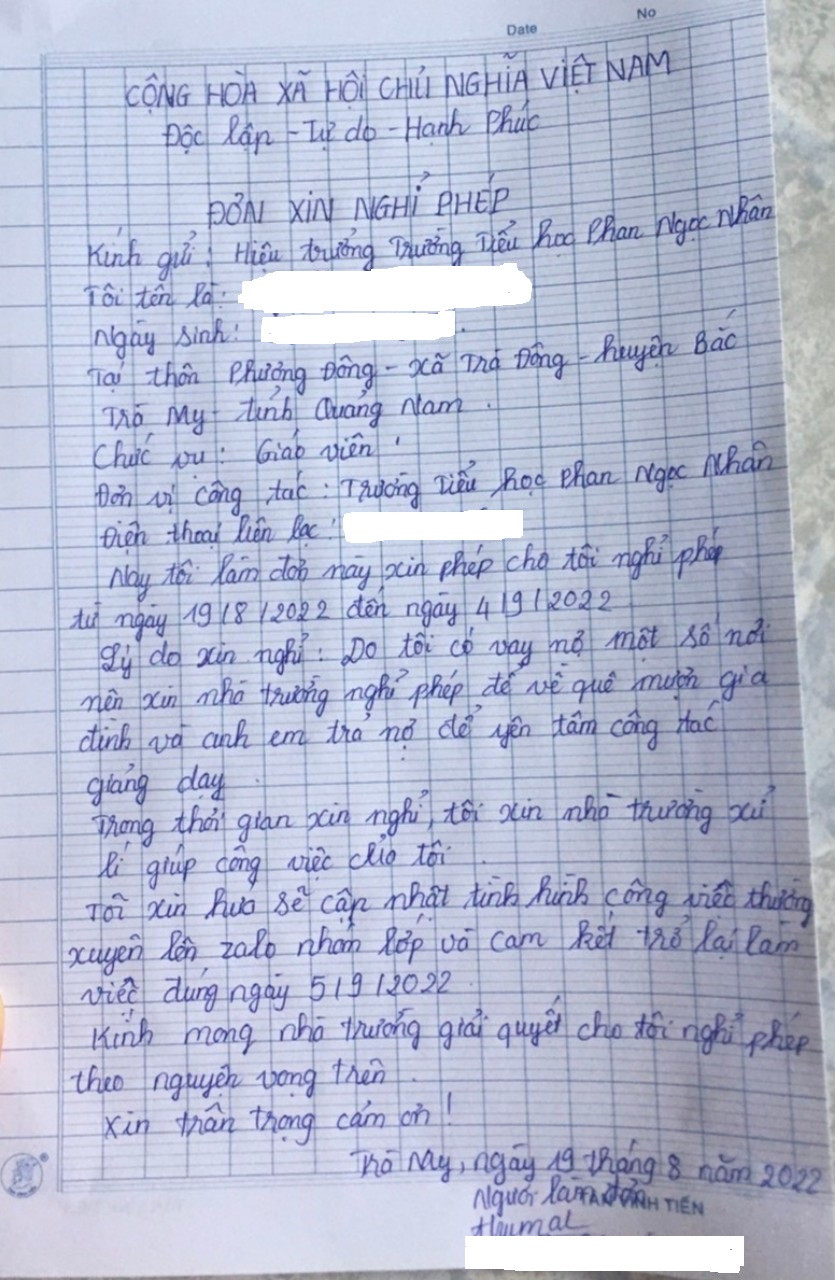 Theo báo Công an TP.HCM, cô N.T.T.M (SN 1992, quê huyện Bắc Trà My, Quảng Nam) – giáo viên Trường tiểu học Phan Ngọc Nhân (thị xã Điện Bàn) có đơn xin nghỉ phép từ ngày 19/8 đến ngày 4/9 với lý do: “Tôi có vay nợ một số nơi nên xin nhà trường nghỉ phép để về quê mượn gia đình và anh em trả nợ để yên tâm công tác giảng dạy. Tôi cam kết ngày 5/9 trở lại trường làm việc”.
