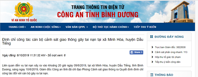 Trưa 10-6, Công an tỉnh Bình Dương chính thức công bố thông tin trên Trang thông tin điện tử Công an tỉnh Bình Dương về việc đình chỉ cán bộ thuộc phòng Cảnh sát giao thông.