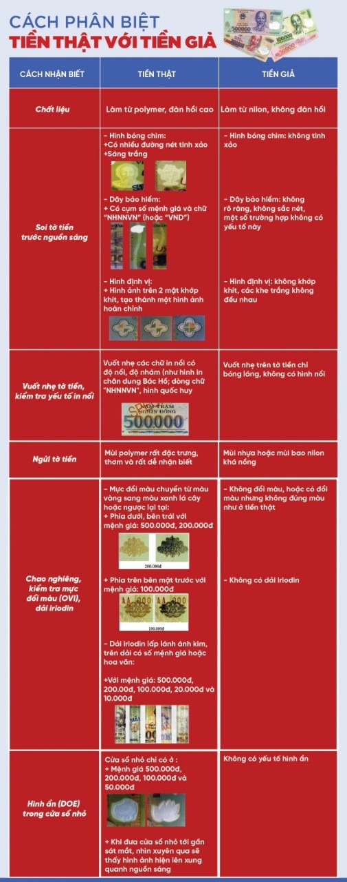 Theo đó, tiền giả polymer mệnh giá 500.000 đồng (seri UF, DQ); 200.000 đồng (seri QH, KD) có đặc điểm nhận biết hình ảnh, hoa văn không sắc nét; hình định vị không khớp khít; mực đổi màu (OVI) được in giả cùng hình ảnh hoa văn mặt trước, không có hiệu ứng đổi màu như tiền thật; mảng ký tự siêu nhỏ là dải mực nhòe; cửa sổ lớn, cửa sổ nhỏ có định dạng không rõ ràng, không cân đối.