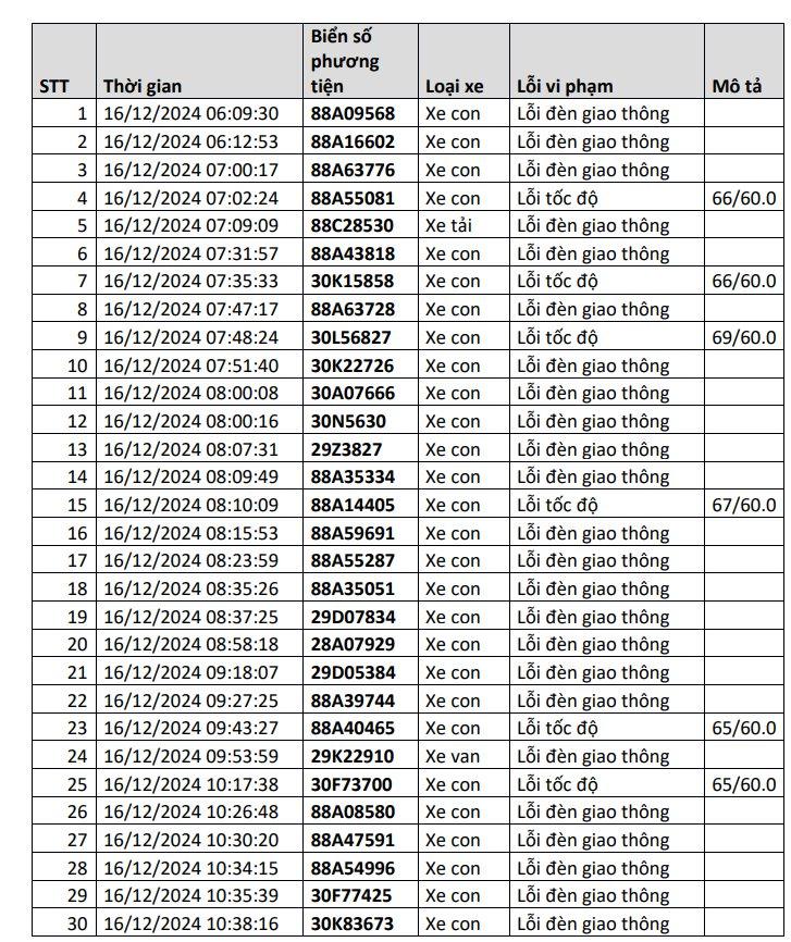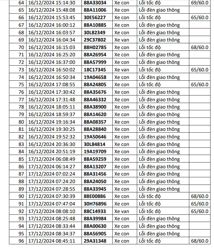 Danh sách bao gồm 1217 trường hợp, với hai lỗi vi phạm phổ biến là lỗi đèn giao thông và lỗi tốc độ. Để xem danh sách phạt nguội, người dân truy cập vào link sau đây .