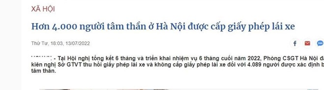 Ngày hôm nay 13-7, một số cơ quan báo chí cũng như mạng xã hội, được cho là trích dẫn thông tin từ hội nghị sơ kết công tác 6 tháng đầu năm, triển khai nhiệm vụ trọng tâm 6 tháng cuối năm 2022 của Phòng CSGT – CATP Hà Nội, sau đó đăng tải bài viết với nội dung dẫn đến cách hiểu là “Đã có hơn 4.000 người mắc bệnh tâm thần ở Hà Nội được cấp giấy phép lái xe”!