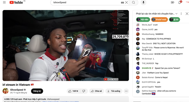 Buổi livestream trên kênh YouTube IshowSpeed đến tối 14-9 thu hút gần 4,1 triệu lượt xem với hơn 4,1 triệu bình luận.