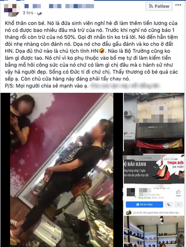 Kèm theo đó là dòng chia sẻ, "Khổ thân con bé. Nó là đứa sinh viên nghỉ hè đi làm thêm tiền, lương của nó có được bao nhiêu đâu mà trừ của nó. Trước khi nghỉ nó cũng báo 1 tháng rồi còn trừ của nó 50%. Gọi điện thoại, nhắn tin không trả lời.