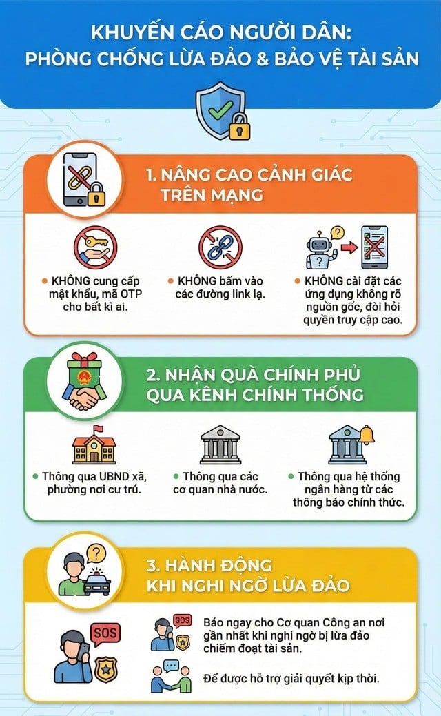 Lợi dụng ý nghĩa nhân văn của chính sách, nhiều đối tượng đã tung ra các chiêu trò lừa đảo nhằm chiếm đoạt tài sản của người dân. Công an khuyến cáo người dân cần nâng cao cảnh giác, tránh rơi vào bẫy của kẻ xấu.
