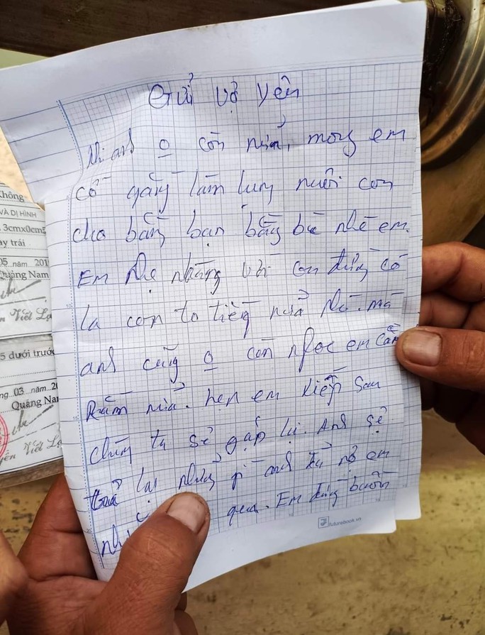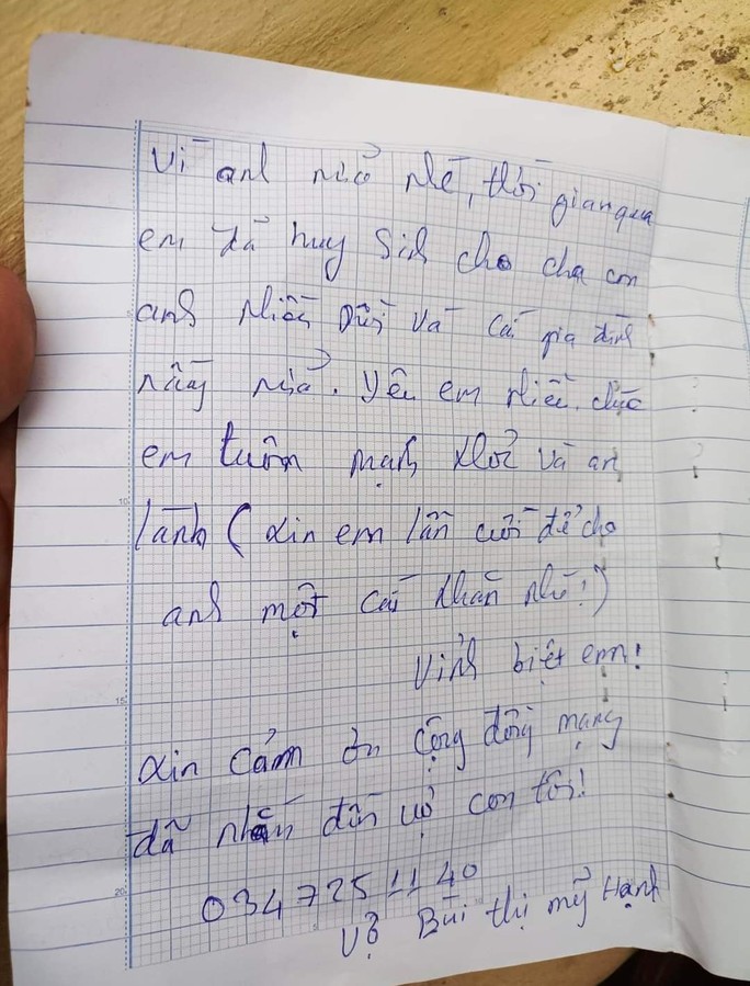Trong thư, người đàn ông nhắn với vợ rằng "khi anh không còn nữa, em cố gắng làm lụng nuôi con", "đừng la con to tiếng nữa nhé, anh cũng không còn nghe em cằn nhằn nữa". Người đàn ông nói vợ đừng buồn, xin vĩnh biệt và "hẹn kiếp sau gặp lại". Trong thư, người đàn ông còn ghi lại số điện thoại kèm tên của vợ, đồng thời gửi lời cảm ơn cộng đồng mạng "đã nhắn đến vợ con tôi".