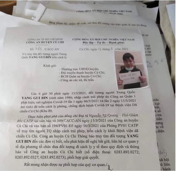 Ngày 17/3, Công an huyện Củ Chi, TP.HCM cho biết, đã phát đi thông báo truy tìm với đối tượng Yang Gui Bin (SN 1986, mang quốc tịch Trung Quốc) vì đã trốn khỏi khu cách ly, phòng chóng dịch Covid-19 của Bệnh viện Dã chiến Củ Chi.