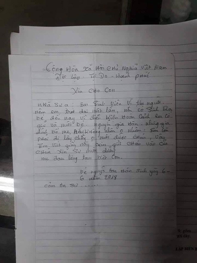 Lúc đó các sư thầy đang làm lễ trong chùa nghĩ người dân gửi bình thường nên nhận trông giúp. Thế nhưng, sau đó không thấy mẹ cháu bé đến nhận, nhà chùa kiểm tra túi đồ thì phát hiện lá thư mẹ cháu bé để lại cùng bộ quần áo của cháu bé.