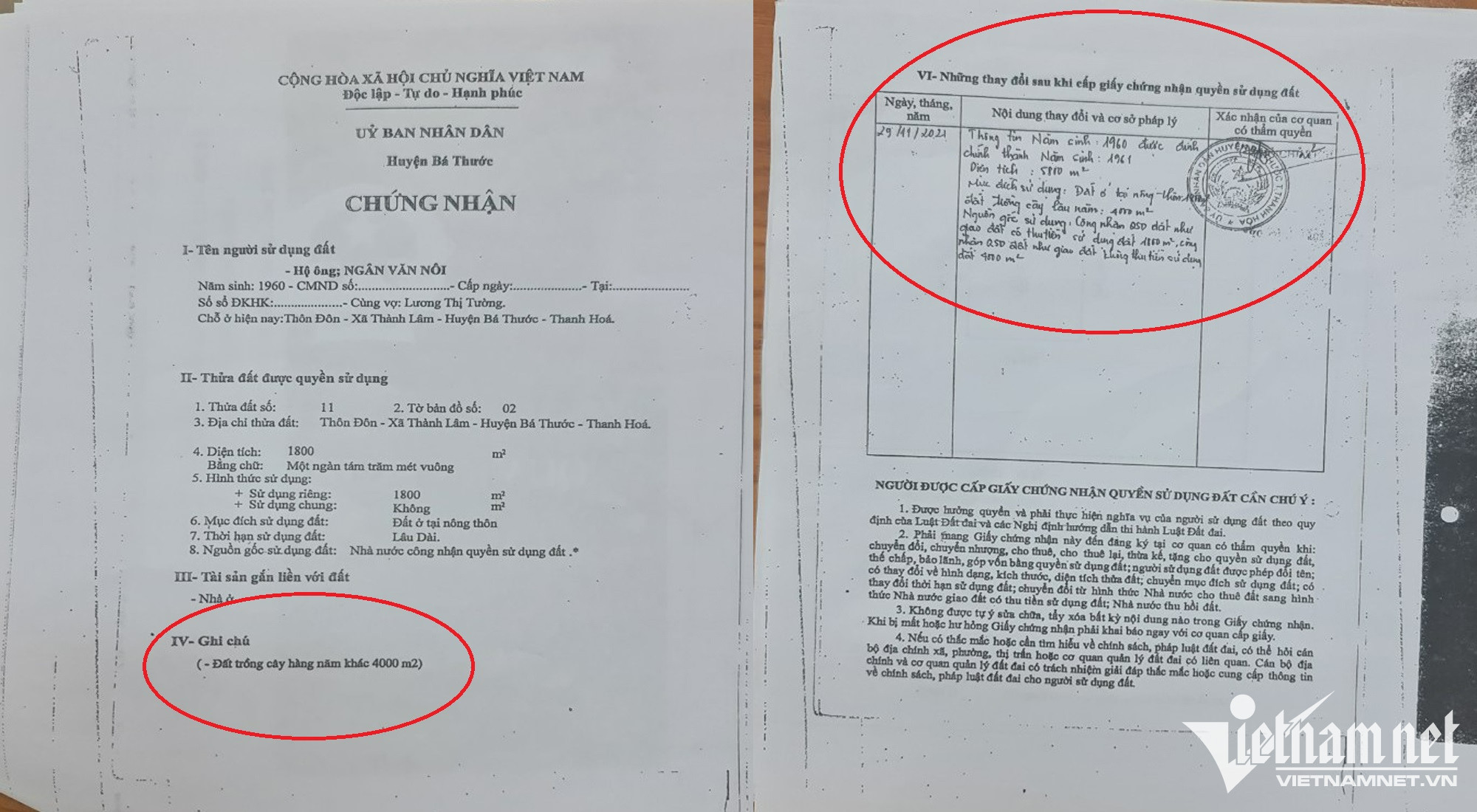 Đến ngày 29/11/2021, UBND huyện Bá Thước xác nhận trong giấy CNQSDĐ của hộ ông Ngân Văn Nôi (thời điểm đã chuyển nhượng nhưng chưa sang tên) biến động với tổng diện tích là 5.800m2, trong đó đất ở nông thôn 1.800m2 và đất trồng cây lâu năm 4.000m2.