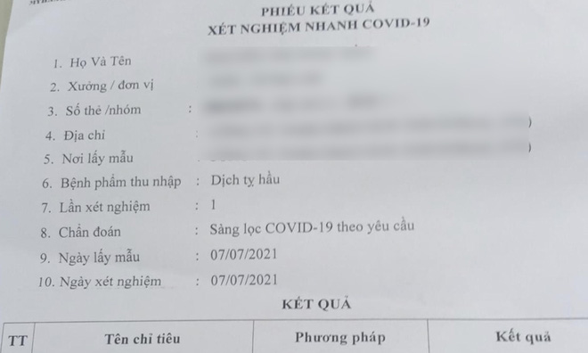 Một nữ công nhân 24 tuổi (ngụ tại huyện Châu Thành, tỉnh Tiền Giang), là công nhân một công ty tại Khu công nghiệp Tân Hương (Tiền Giang) phản ánh trên Tuổi trẻ online, hôm 7/7, chị cùng các đồng nghiệp làm việc tại 1 xưởng được phát một tờ phiếu kết quả xét nghiệm nhanh Covid-19.