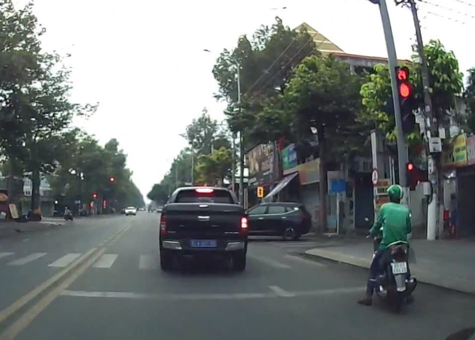 Theo hình ảnh từ camera hành trình của một phương tiện ghi lại, vào khoảng 14h49 ngày 1/4, xe ô tô bán tải biển số xanh 61A-001.59 chạy trên đường Lê Hồng Phong, khi đến một giao lộ thuộc phường Phú Hoà (TP Thủ Dầu Một, tỉnh Bình Dương) thì đèn tín hiệu bật đỏ.