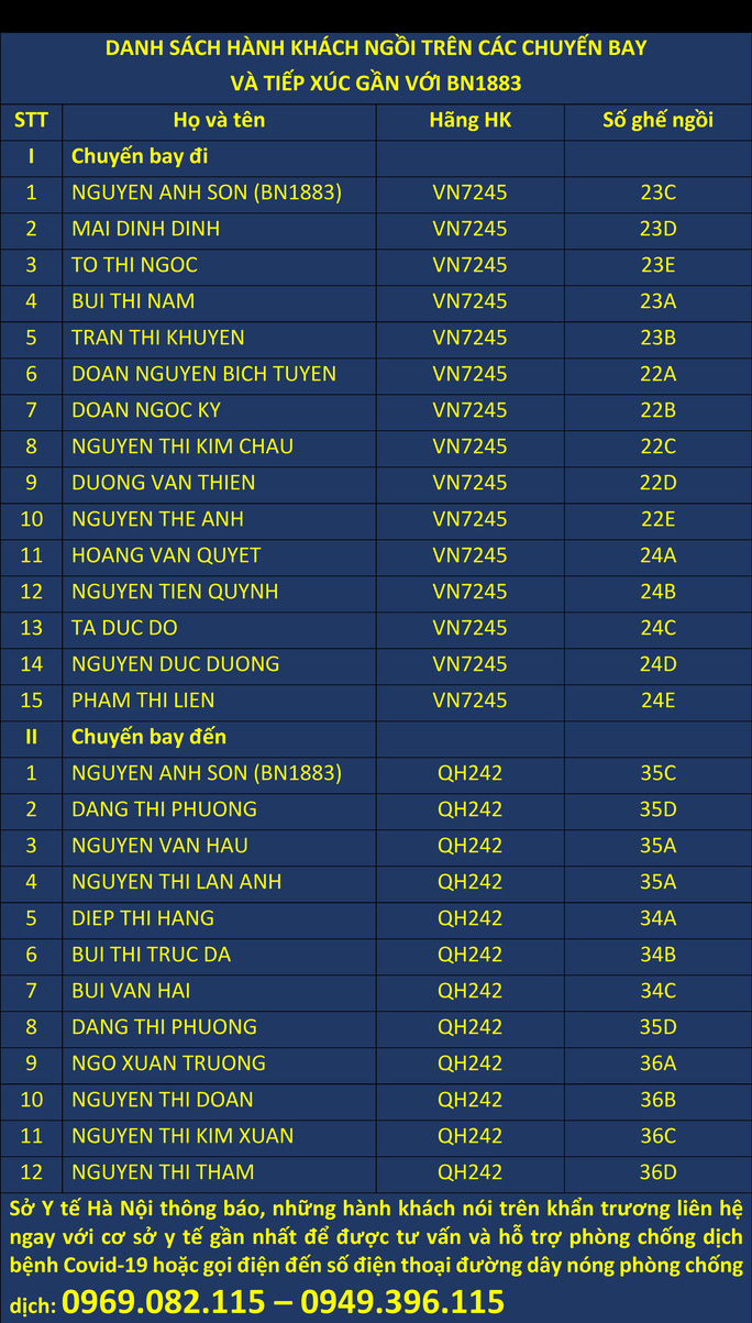 Những hành khách đi trên 2 chuyến bay này cần liên hệ với cơ sở y tế gần nhất để được tư vấn và hỗ trợ phòng chống dịch bệnh Covid-19 hoặc gọi đến số điện thoại đường dây nóng phòng chống dịch: 0969.082.115 - 0949.396.115