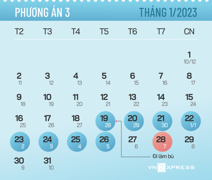 Phương án 1, công chức, viên chức và người lao động sẽ nghỉ 7 ngày từ 29 tháng Chạp đến hết mùng 5 tháng Giêng (tức 20-26/1/2023). Trong đó có 5 ngày nghỉ chính thức và 2 ngày nghỉ bù.
