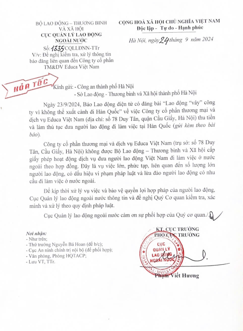 Ngày 24-9, Phó Cục trưởng Cục Quản lý lao động ngoài nước (Bộ LĐ-TB-XH) Phạm Viết Hương ký văn bản khẳng định Công ty CP Thương mại và Dịch vụ Educa Việt Nam không được Bộ LĐ-TB-XH cấp phép hoạt động dịch vụ đưa người lao động đi làm việc ở nước ngoài theo hợp đồng.
