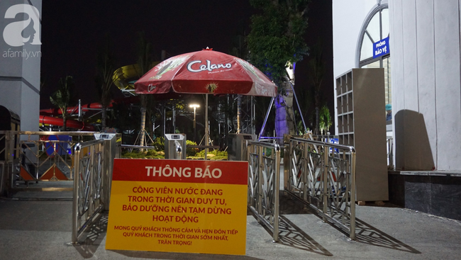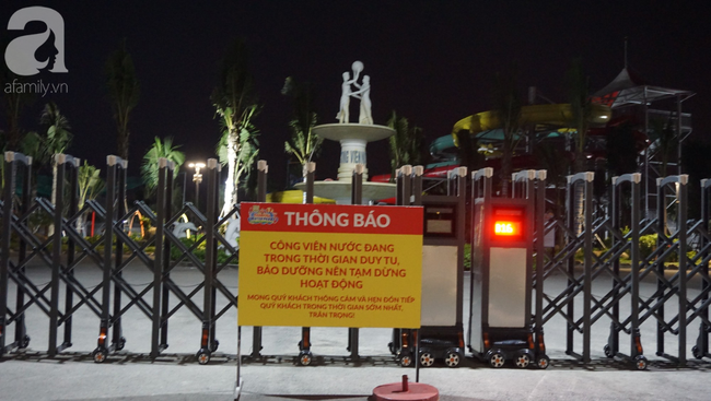 Nội dung tấm biển ghi rõ: "Công viên nước đang trong thời gian duy tu, bảo dưỡng nên tạm dừng hoạt động. Mong quý khách thông cảm và hẹn đón tiếp quý khách trong thời gian sớm nhất".