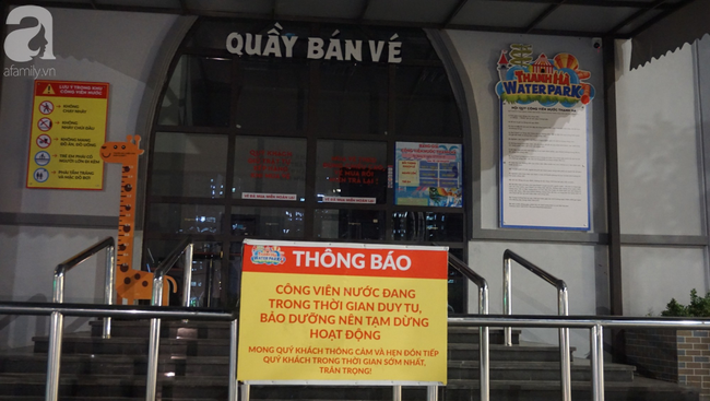 Theo ghi nhận, trước khu vực cổng của công viên nước Thanh Hà đã đặt tấm biển thông báo tạm ngừng hoạt động.