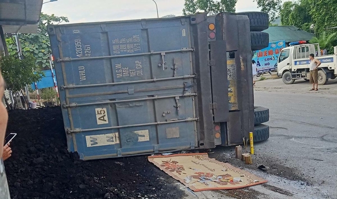 Hai người trên xe máy bị thùng container đè tử vong tại chỗ, than trong thùng xe đổ vương vãi trên mặt đường. Một số nhân chứng cho biết xe container đi với tốc độ tương đối nhanh khi vào cua.