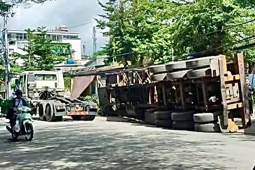 Khi xe ra khỏi bãi, thùng container nặng khoảng 10 tấn bất ngờ lật sang phải, đè lên chiếc xe máy cùng hàng hoá của một người đàn ông đang dựng trên vỉa hè. May mắn, người đàn ông này đã đi giao hàng nên không bị sao.