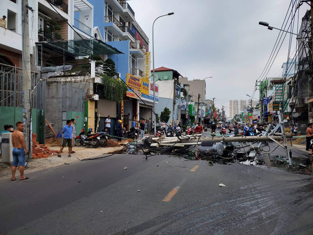 Thời điểm trên, cột điện trước địa chỉ 916 Lạc Long Quân (quận Tân Bình) bất ngờ bật gốc đổ xuống đường. Lúc này, nhiều người đang lưu thông trên đường giật mình nhưng may mắn tránh kịp thời.