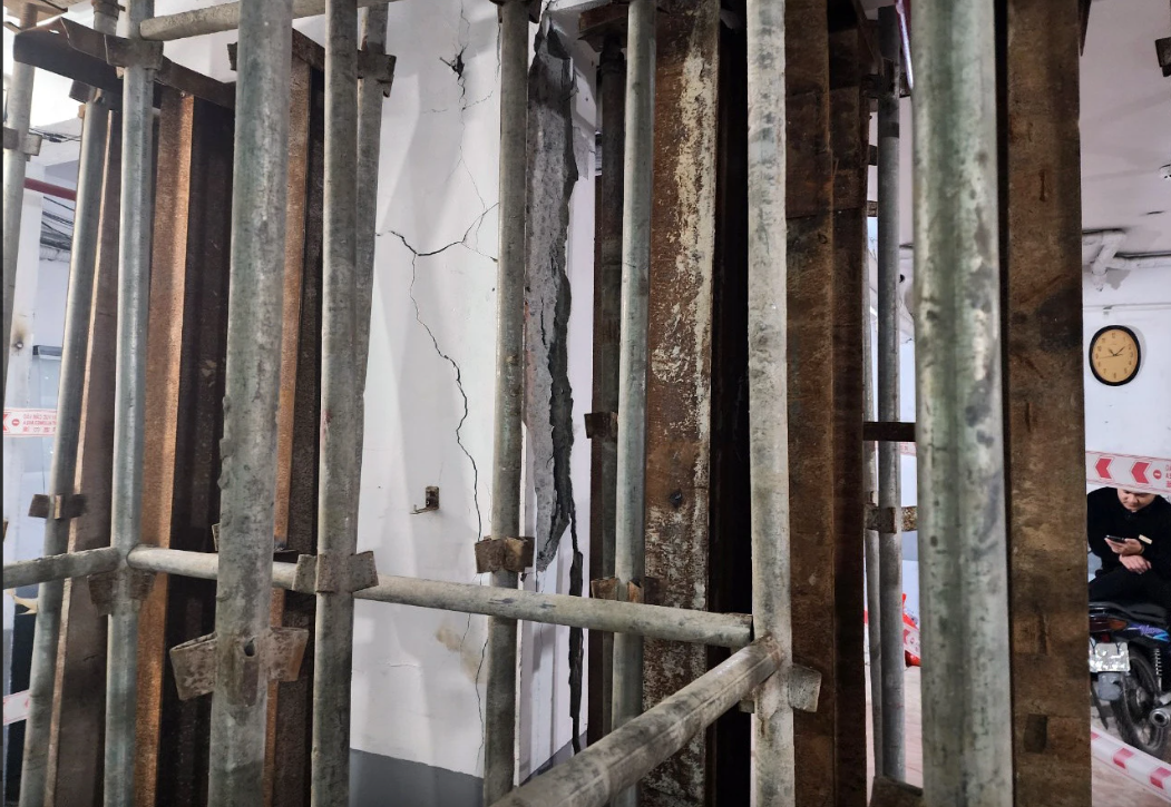 Nguyên nhân là do một số cột bê tông, cốt thép ở tầng 1 của tòa chung cư này bị nứt toác từ nhiều ngày nay.