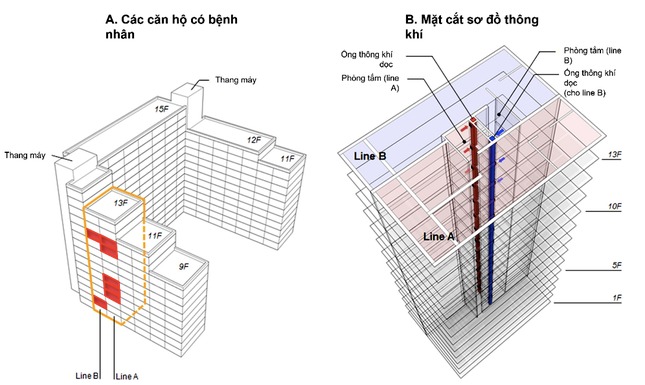 PGS.TS Trần Văn Hiếu, khoa Sinh học và Công nghệ Sinh học, Trường Đại học Khoa học Tự nhiên, Đại học Quốc gia TPHCM nói rằng, khi có một ca mắc COVID-19 trong toà nhà, các con đường lây nhiễm khả thi có thể nghĩ tới là thông qua không gian chung như thang máy hay gián tiếp tiếp xúc bằng các nút thang máy. Tuy nhiên, khi lấy mẫu bệnh tại một chung cư ở Hàn Quốc, các ca nhiễm được phát hiện đều nằm cùng theo một chiều thẳng đứng với ca nhiễm đầu tiên. Các căn tại toà chung cư này đều có lỗ thoát khí tại các phòng tắm thông ra một lối thoát khí chung.