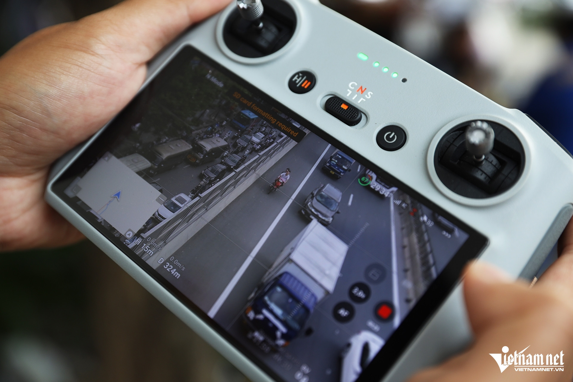 Để đảm bảo an toàn và xử lý triệt để vi phạm, một chiến sĩ CSGT điều khiển flycam (thiết bị không người lái được sử dụng để quay phim và chụp ảnh) bay dọc tuyến đường nhằm ghi nhận, phát hiện vi phạm rồi báo qua bộ đàm cho chốt xử lý công khai tại lối ra đường cao tốc.