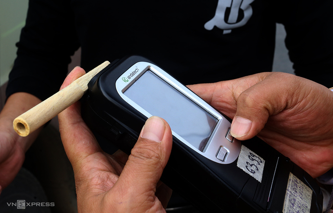 Thiếu tá Khánh mở hộp giấy hình chữ nhật, bên trong có khoảng 50 ống thổi bằng tre được đóng gói bằng túi giấy. Tài xế được tự bóc các túi giấy này để xem xét ống tre trước khi cảnh sát gài ống vào máy đo nồng độ cồn.