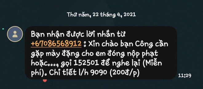 Cảm thấy có điều bất thường, chị T. không dám bắt máy. Sau đó, đầu số này lại để lại tin nhắn thoại cảnh báo: Xin chào bạn. Công cần gặp mày đặng cho em đóng phạt.