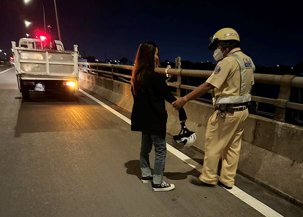 Ngay lập tức, tổ CSGT tiếp cận để níu giữ cô gái và liên tục động viên, thuyết phục. Sau một lúc, cô gái cũng nguôi lòng, từ bỏ ý định.