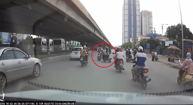 Một thanh niên ngã nhào khi va chạm với một phương tiện đi trước bị CSGT đang chặn lại. Ảnh cắt từ clip |