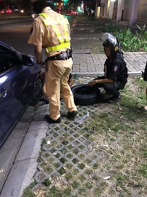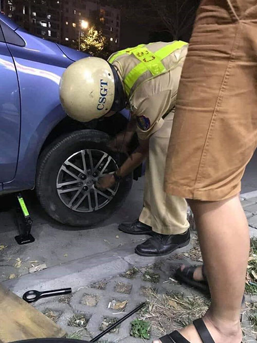 Thời điểm xảy ra sự cố xe có chở cả phụ nữ, người già và trẻ nhỏ, mọi người đều sợ hãi, hoảng loạn. Nam tài xế cũng vô cùng bối rối do lần đầu gặp sự cố trên đường. Lúc này, anh Vũ trấn an tinh thần người dân, sau đó phối hợp với một chiến sĩ CSCĐ tài xế thay bánh mới để phương tiện tiếp tục lưu thông an toàn.