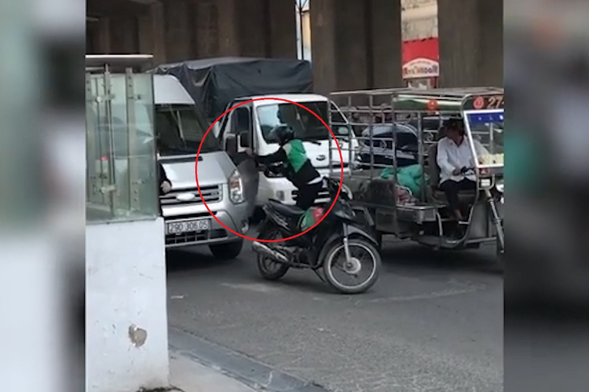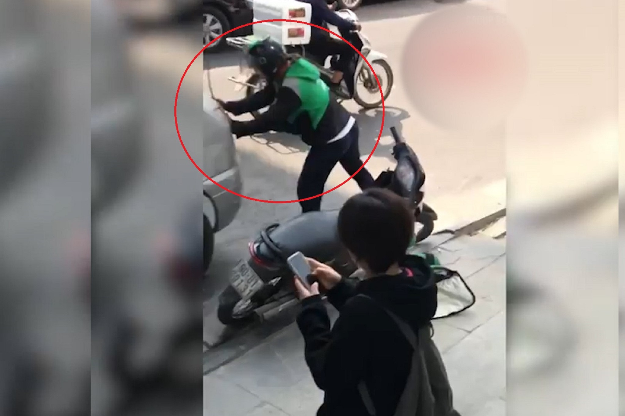 Sau màn thách đố, lái xe ôm công nghệ thách tài xế ô tô đâm mình, lái xe ô tô sau đó đã tông thẳng vào xe máy, bất chấp nam lái xe ôm công nghệ chặn lại, dùng dây cao su quất vào ô tô nhưng chiếc xe này đã bỏ chạy theo hướng Nguyễn Trãi – Khuất Duy Tiến.
