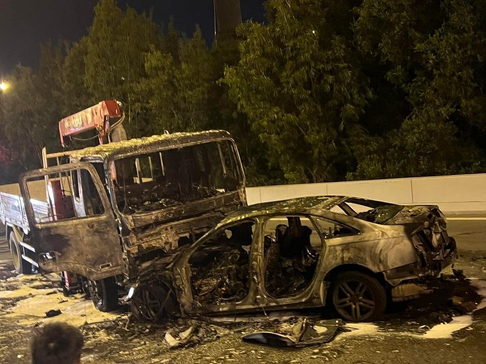 Cú tông cực mạnh khiến hai phương tiện cháy ngùn ngụt. Tài xế xe tải cẩu mở cửa thoát kịp ra ngoài. Riêng hai người khác ngồi trên ôtô 4 chỗ tử vong tại chỗ (chưa rõ danh tính).