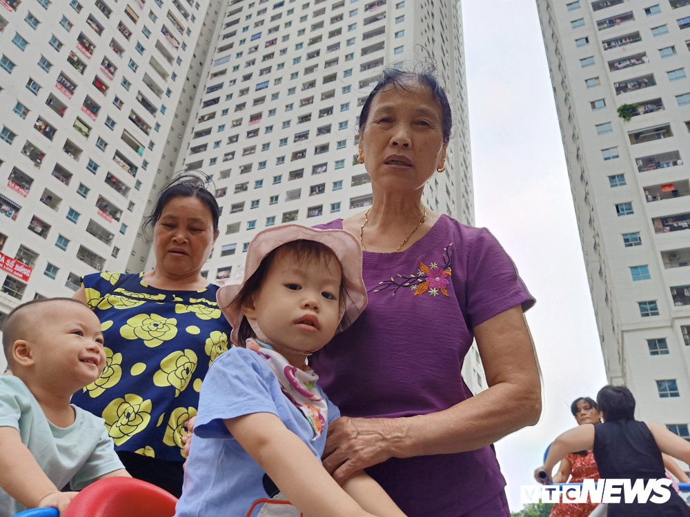 Đứng trông hai đứa cháu ở khu vực sân chơi, bà Lâm Thị Gái (trú tại tòa nhà HH2C) vẫn chưa hết sự mệt mỏi vì hai cháu nhỏ mới bị bệnh tiêu chảy, nôn khi ăn, uống.