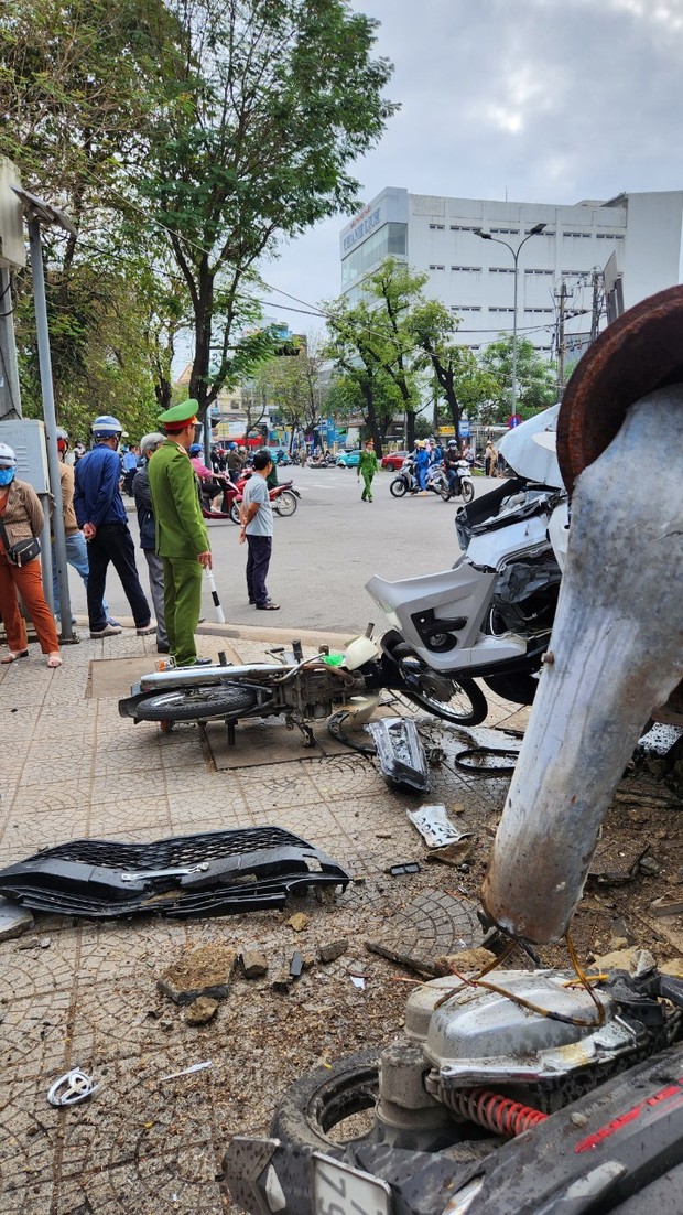 Không dừng lại ở đó, chiếc Toyota Raize lao nhanh ra giao lộ Nguyễn Huệ - Phan Bội Châu (phường Vĩnh Ninh, thuộc nội đô thành phố Huế), xoay vòng đổi hướng sang phía phải rồi tông gãy cột đèn, leo lên vỉa hè ủi bay thêm 3 xe gắn máy đang đỗ tại đây.