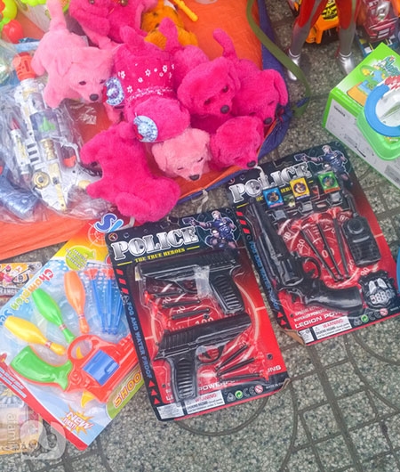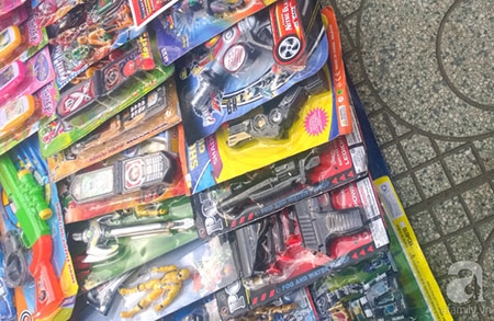 Từ các cửa hàng bán đồ chơi trẻ em cho đến những người bán rong đều bán đồ chơi bạo lực với đủ loại súng, dao, kiếm… Dù bị cấm nhưng đồ chơi mang tính bạo lực vẫn len lỏi trên thị trường và rất đắt hàng.