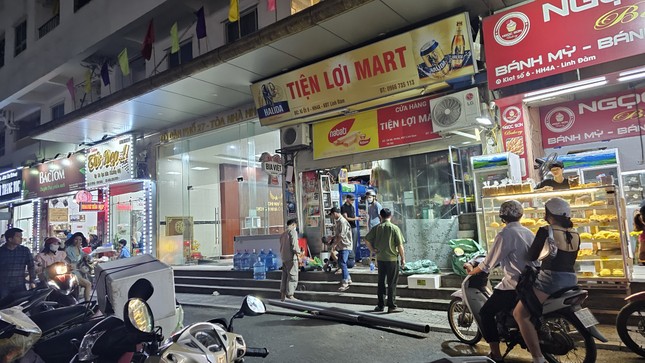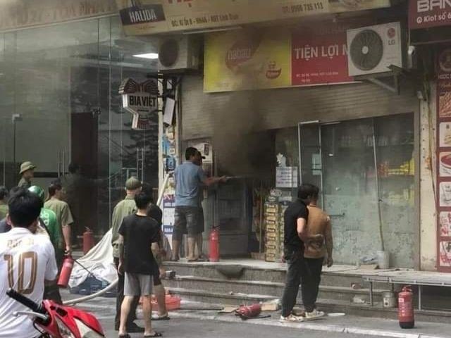 Phát hiện đám cháy tại cửa hàng tiện lợi ở khu chung cư HH Linh Đàm (phường Hoàng Liệt, quận Hoàng Mai, Hà Nội) người dân hô hoán nhau dập lửa, khống chế vụ cháy.