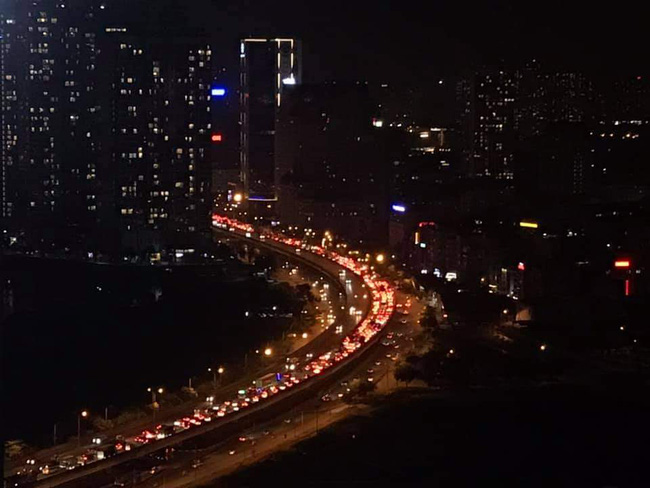 Theo ghi nhận của chúng tôi, đường Vành đai 3 trên cao đoạn từ ngã tư Khuất Duy Tiến tới gần nút giao Cao tốc Pháp Vân - Cầu Giẽ rơi vào tình trạng ùn tắc nghiêm trọng dù đã nửa đêm. Ước tính đoạn đường ùn tắc kéo dài tới khoảng 10km.