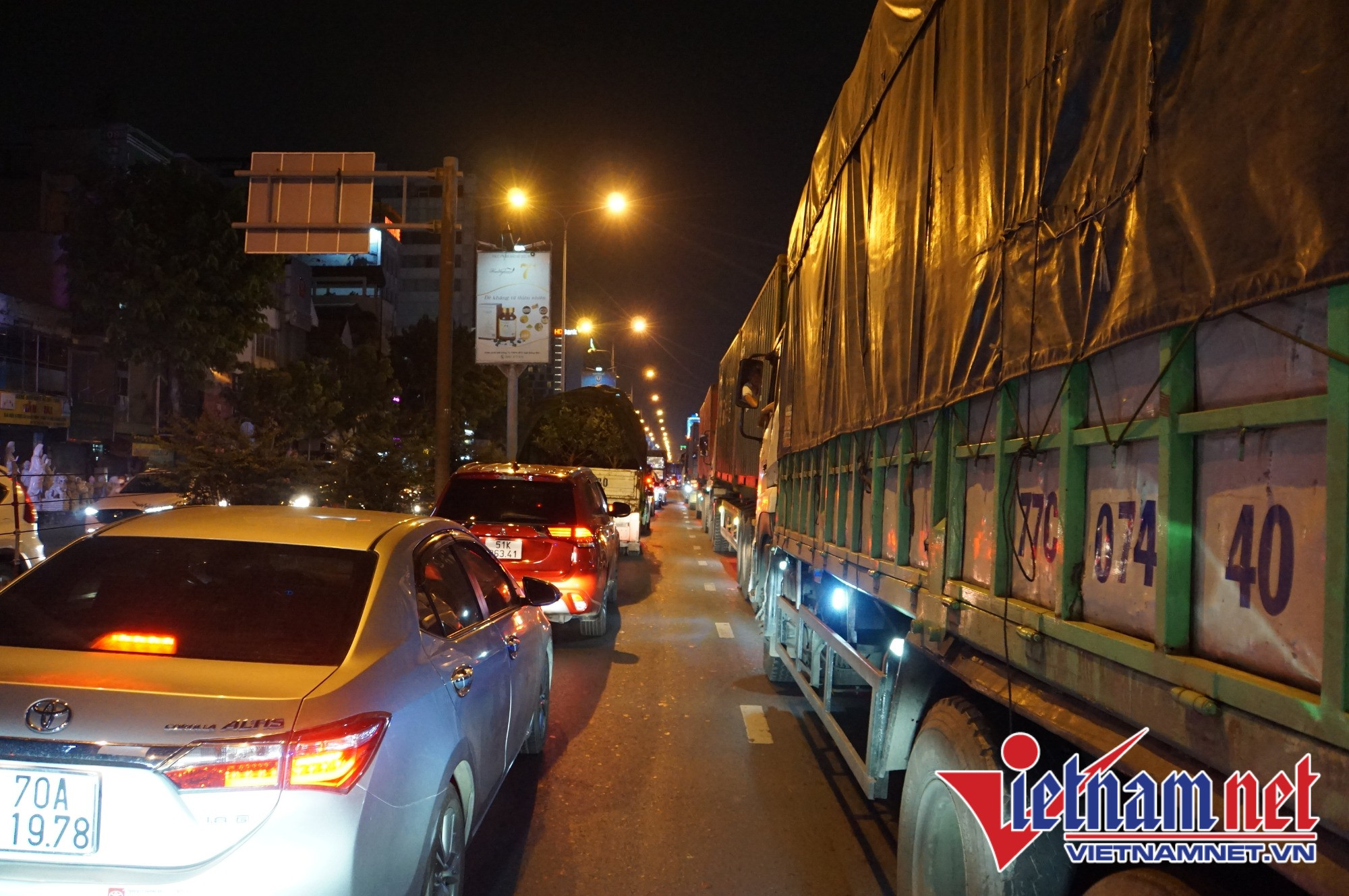 Đến 22h, thời điểm xe container, xe tải nặng được phép lưu thông vào trung tâm TP khiến tình trạng ùn tắc càng trở nên nghiêm trọng hơn.
