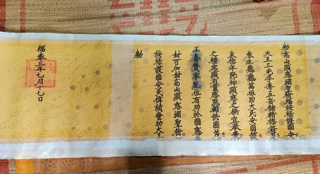 Liên quan tới các đạo sắc phong nghi bị đánh cắp và được bán đấu giá tại Trung Quốc, ông Nguyễn Mạnh Hùng - Phó Chủ tịch UBND huyện Tam Nông trao đổi với Tiền Phong. Huyện báo cáo sở, ngành, công an địa phương. Bước đầu địa phương xác nhận một số đạo sắc phong nằm trong bộ 40 sắc phong bị mất tại đền Quốc tế xã Dị Nậu, huyện Tam Nông vào tháng 5/2021.